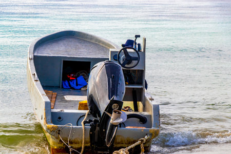 Playa del Carmen Quintana Roo Mexico August 05, 2023 Boat yacht catamaran ship ferry jetty pier and harbor at the tropical Mexican Caribbean beach panorama view and turquoise blue water in Playa del Carmen Mexico.