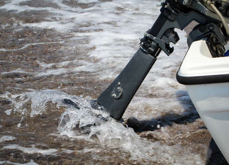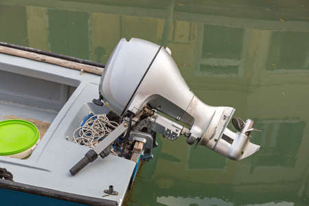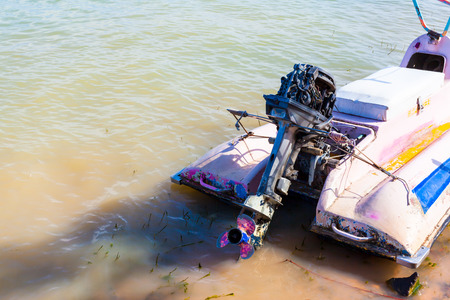 Damaged motorboat engine left on the beach, motorboat engine repair