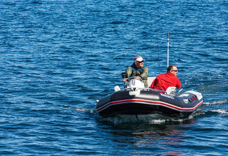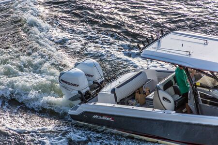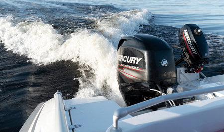 Sankt-Petersburg, Russia, August 27, 2021: Modern new fishing sport boat with a brand new Mercury FourStroke outboard engine speeding on the lake.
