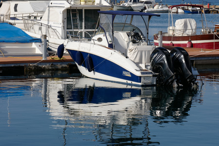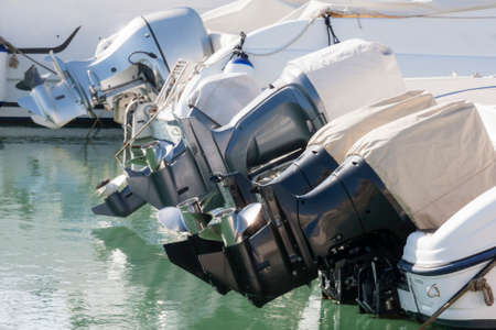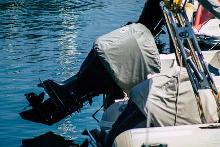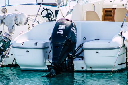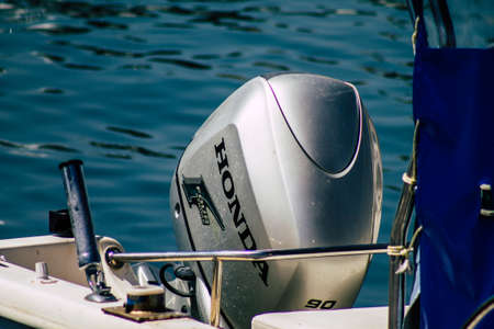 Limassol Cyprus March 24, 2020 Closeup of a motor of a boat moored in the marina of Limassol in Cyprus island