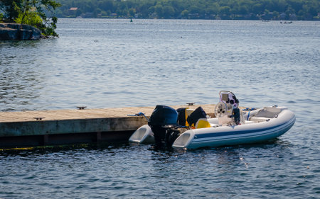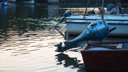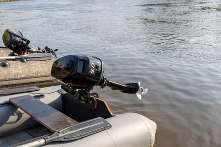 Inflatable motor boat on the water near the shore, outside. Calm water, sunset, selective focus on the boat motor. Fishing concept, boat trips
