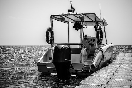 Ibiza, Spain - June 10, 2017: Four Suzuki DF300AP engines on inflatable rib boat. Spain