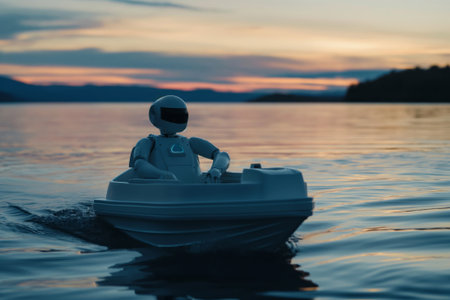 Humanoid robot steering a small boat across calm waters during a beautiful sunset