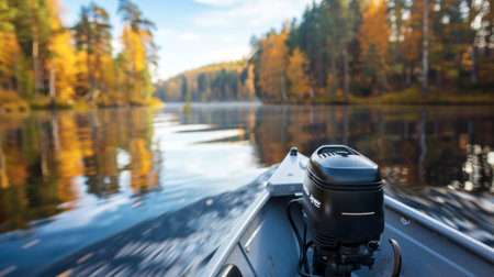 Boating through scenic autumn forest lake in a metal boat with motor. Concept of nature exploration, outdoor adventure, seasonal travel. Copy space.