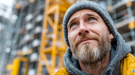 Male construction worker looks up at the building site, wearing a gray beanie and yellow jacket.