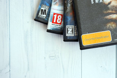 KYIV, UKRAINE - SEPTEMBER 8, 2025 ESRB PEGI and CERO game ratings on different videogames close up. American, European and Japanese age rating marks