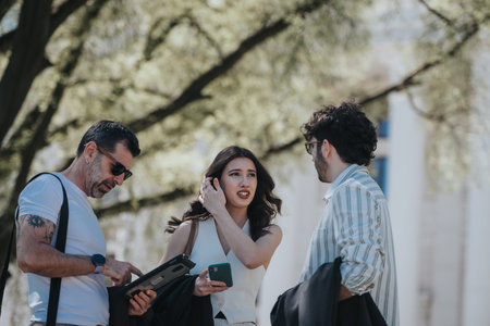 Business professionals engaged in a strategic discussion outdoors in a city