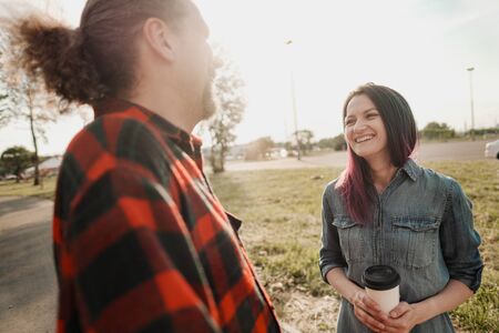 An elderly hipster man with long hair and a beard in a red plaid shirt is talking to a young woman. Summer warm evening in the park. The relationship of the father and adult daughter.