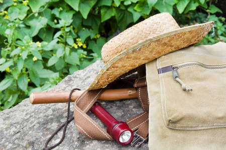 Backpack, Hiking Equipment, and Other Items on a Rock