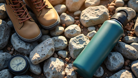 Hiking boots, compass, and teal water bottle rest on grey stones, bathed in warm light, creating a peaceful outdoor adventure vibe ideal for active lifestyle marketing.