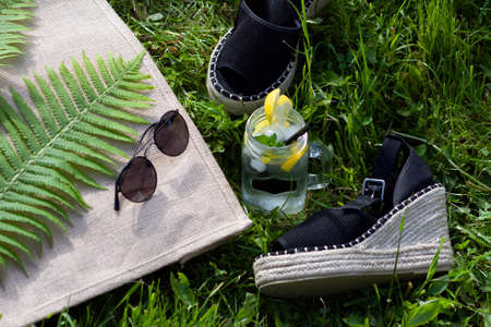 Feet of a young girl on a background a green grass with bottle of tablet computer, water and bag. Travel and holliday concept