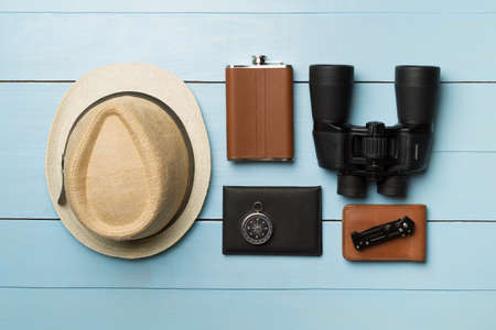 Hiking or travel equipment with boots, compass, binoculars, matches on wooden background. Active lifestyle concept.