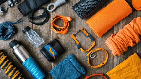 A vibrant arrangement of fitness gear and accessories. Perfect for showcasing healthy lifestyle essentials such as bottles, straps, towels, and more.