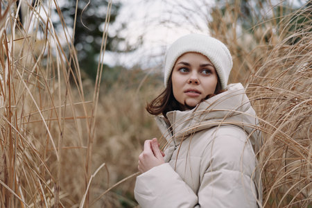 Winter scene featuring a woman in a beige coat and white knit hat among tall grasses, natural backdrop, calm mood, thoughtful gaze, outdoor solitude and cool air.