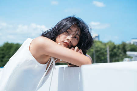 Thai woman leaning on white wall with sexy looking, outdoor.