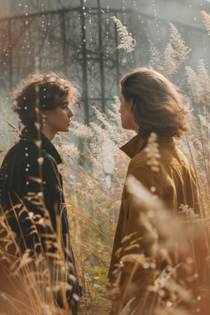 Two people standing in a field of tall grass, one wearing a black coat and the other wearing a yellow coat