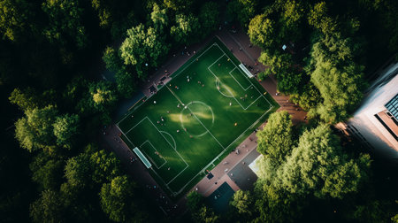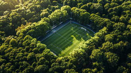 A soccer field seen from above, nestled among dense trees, providing a green backdrop to the vibrant sports field.