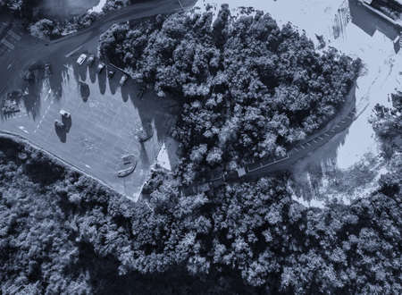 Empty car parking lots aerial top view from drone. Concrete urban background with white lines.