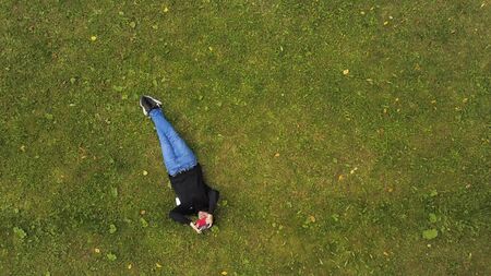 Top view of a young man wearing blue jeans and black sweater lying on green grass and using his device. Stock footage. Aerial view of a male with a smart phone in his hands lying on the meadow,
