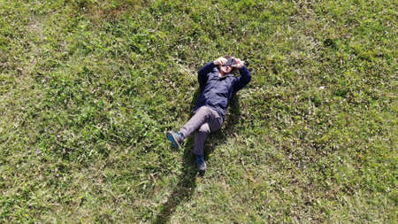 Aerial drone view of a cyclist lying down and resting in a meadow