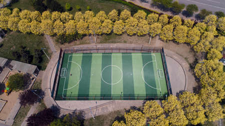 Aerial overhead drone shot of football field by Ionian sea in Argostolion, on Kefalonia Island