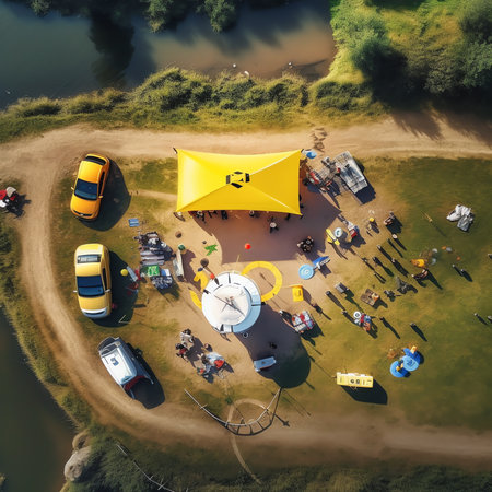 Aerial detail of festival site with toilets, picknick and restaurant area. Crowd management concept.