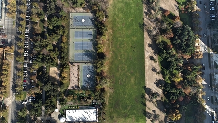 Aerial view of a meticulously designed urban park with walking paths, trees, and water features