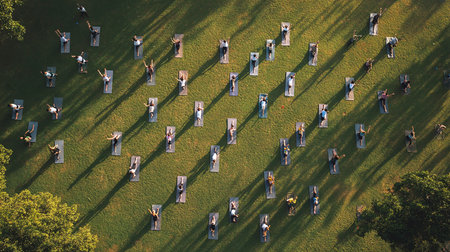 Aerial view from a drone of a group of people doing physical exercise on a jogging track