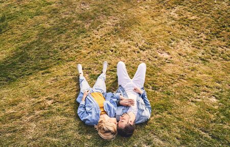 Top view of happy lesbian couple lying on the grass in summer park. Women in love dreaming, relaxing while spending time together outdoors
