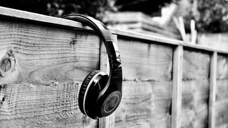A pair of headphones rests on a rustic wooden bench, surrounded by fallen autumn leaves.