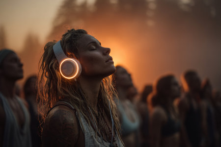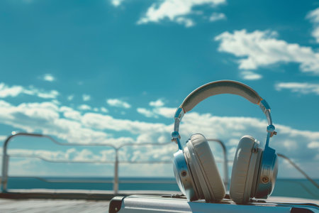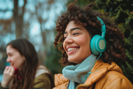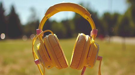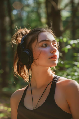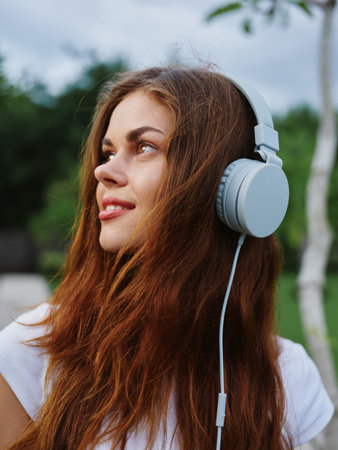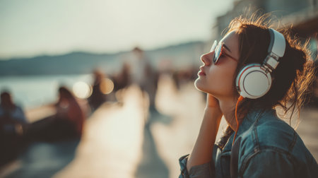 A girl wearing headphones basks in the warmth of the sun, her hair dancing in the breeze while she immerses herself in the music. Her expression radiates pure joy and carefree spirit.
