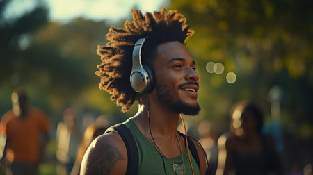 runner in park with ears on listening to music, in the style of Afro-Caribbean influence.