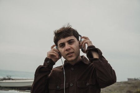 A young man with braided hair relaxes on the shore, wearing headphones and absorbing the soothing sounds of the sea under a blue sky.