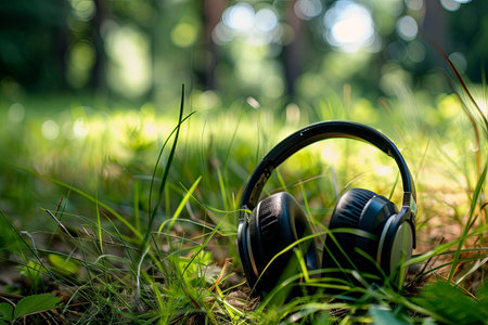 This image features vintage headphones elegantly placed on the ground amidst lush greenery and tree roots, capturing the essence of tranquility and outdoor exploration.