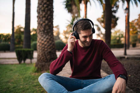 Young man wearing headphones enjoying music while walking in a city park during a sunny autumn day