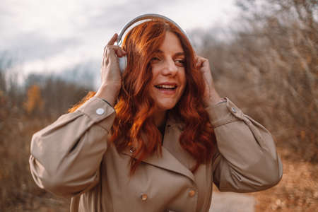 Close up smiling curly hair caucasian woman with large headphones walking outdoor. Enjoy the moment and music. Freedom and happiness, simple pleasures concept.