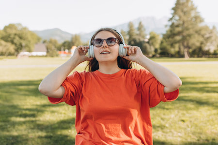 Lifestyle, brunette Caucasian girl enjoying music with headphones in a park. Young girl in red t-shirt and jeans, copy space and paste