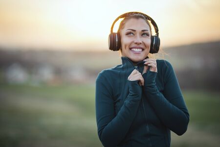 Young smiling female runner listening to music and preparing to jogging at sunset in mountains.