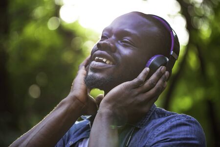 Black man wearing casual attire listening music on bright background. Portrait of man with headphones against colored backdrop
