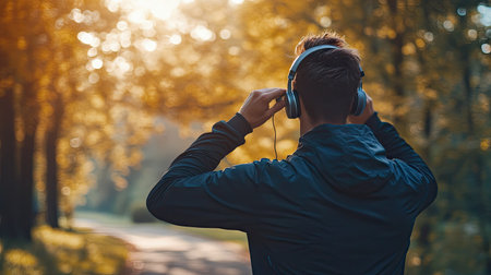 Runner adjusting their headphones, ready to start a morning run on a scenic park trail, the path stretching ahead.
