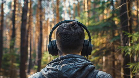 Back view Man in headphones in the mountains in nature meditates, relaxes and takes care of mental health, AI generated.