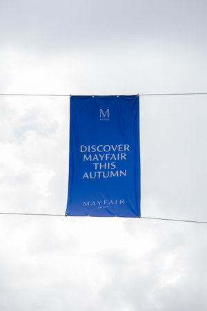 London, UK - September 1, 2022: Low angle view against sky of Discover Mayfair banner on Duke Street in Mayfair, an affluent area in the West End of London in the City of Westminster borough.