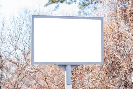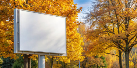 White blank advertisement billboard mockup. autumn forest trees blue sky background.