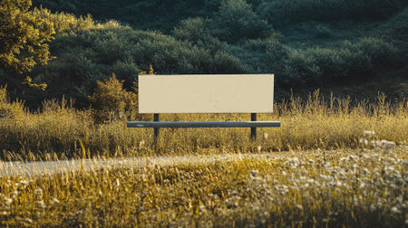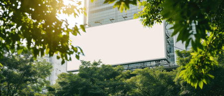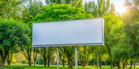 An empty billboard stands tall amidst lush greenery under a clear blue sky. The scene conveys a sense of calm and openness in the surroundings. AI Generative
