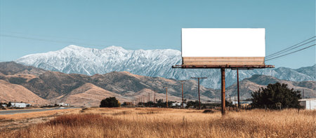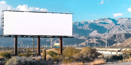 Large blank billboard standing beside a desert road leading to mountains under a vibrant blue sky offers advertising potential