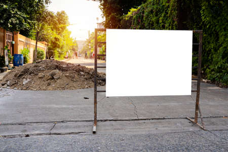 information board near the construction site. blank information banner with white mockup on metal construction site gate under bright sunlight outside