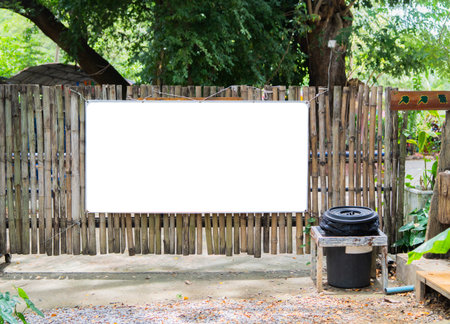 Blank billboard mockup rectangle on the bamboo wall with a trash can nearby in a rural resort in Thailand. Copy space.
