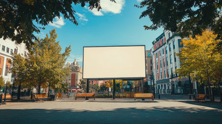 A spacious urban park scene featuring an empty billboard, surrounded by trees and benches under a bright blue sky, ideal for advertising or design projects.
