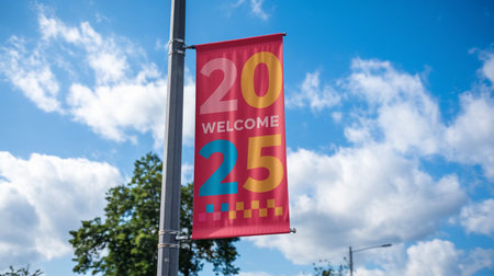 a welcome banner is attached to a pole under a blue sky with clouds on a sunny day in an outdoor setting