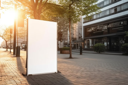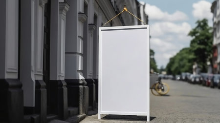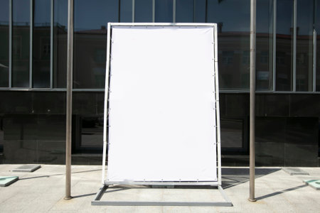 An empty advertising banner stands on a city street.